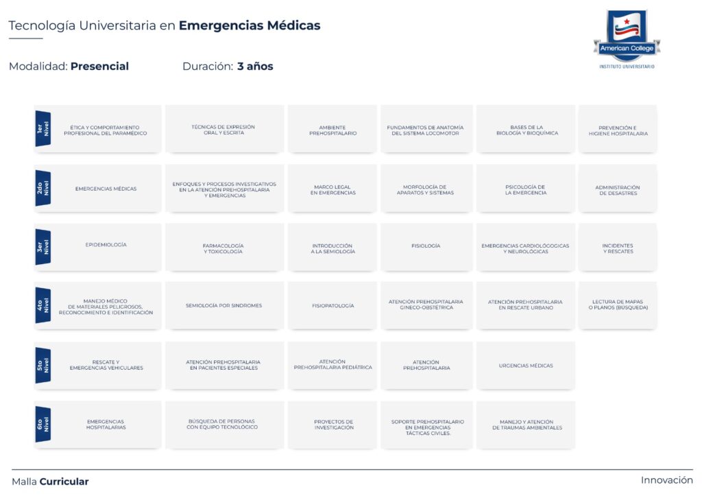Ser el único instituto del país que otorga el título con alta denominación, convierte nuestra educación en única. El contar docentes especializados en el área, con un sistema, escenarios y una metodología de simulación práctica de última tecnología enfocado al rescate, urgencias clínicas y trauma prehospitalario permiten el desarrollo de habilidades y competencias necesarias para destacar como profesional en el ámbito prehospitalario. Por todo esto, el Instituto Universitario American College siempre será tu mejor opción.